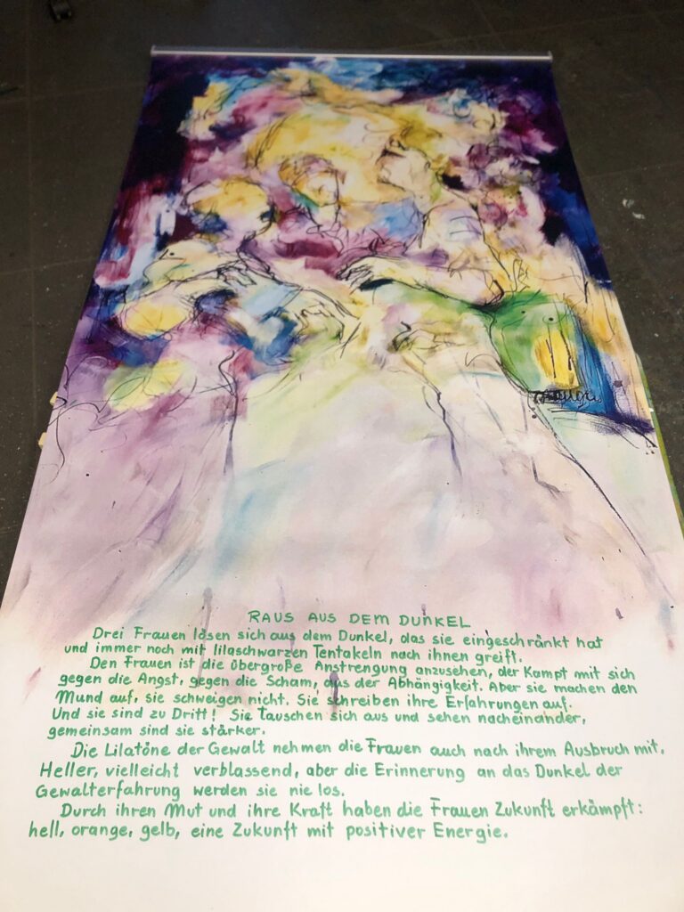„Drei Frauen lösen sich aus dem Dunkel der Gewalt, das sie eingeschränkt hat und immer noch mit lilaschwarzen Tentakeln nach ihnen greift. Ich sehe den Frauen die übergroße Anstrengung an, den Kampf mit sich gegen die Angst, gegen die Scham, aus der Abhängigkeit.